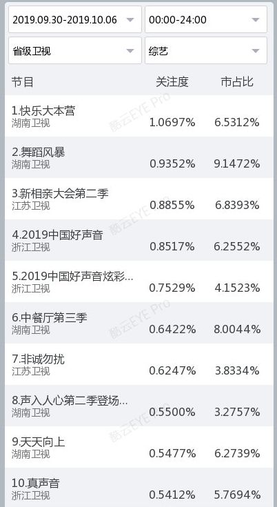 常规节目如《遇见天坛》《中餐厅3》《我们恋爱吧》《快乐大本营》《非诚勿扰》国庆期间也在自身平均水平上下浮动,未发生显著变化。