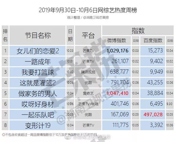 此外,《做家务的男人》上周微博指数最高,稍微领先于《女儿们的恋爱2》;《一起乐队吧》的百度指数则领跑优势明显。