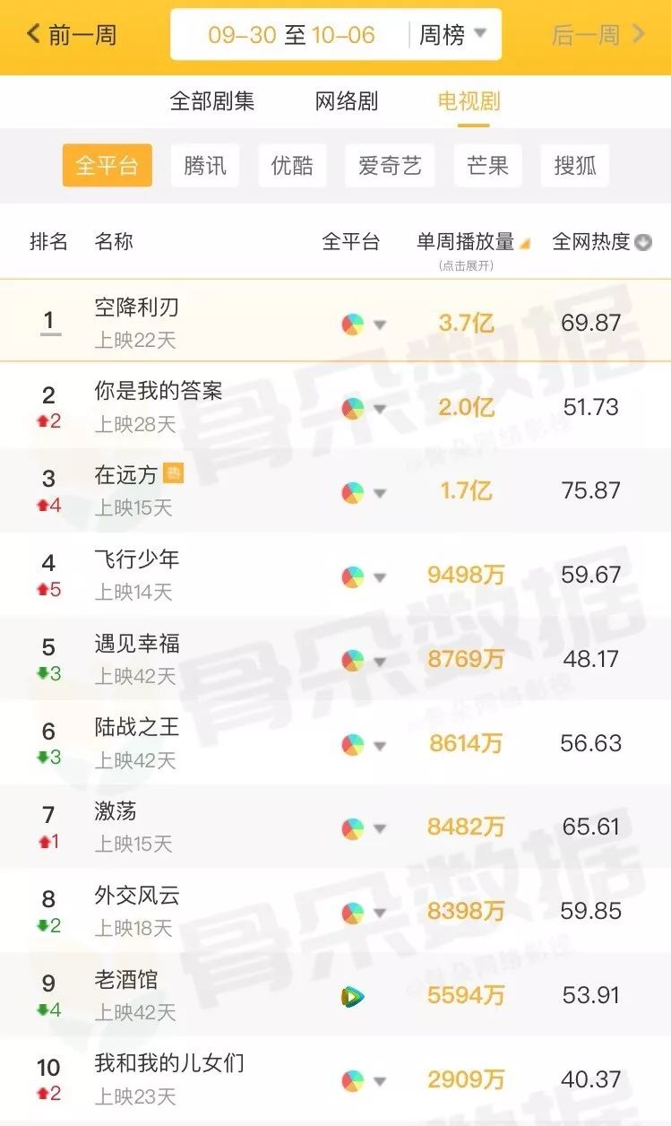 网播方面,《空降利刃》以3.7亿周播量稳居第一;周播剧《你是我的答案》网播量2亿排位第二,名次上升两位;《在远方》播放量也成功破亿,且网络热度较高。