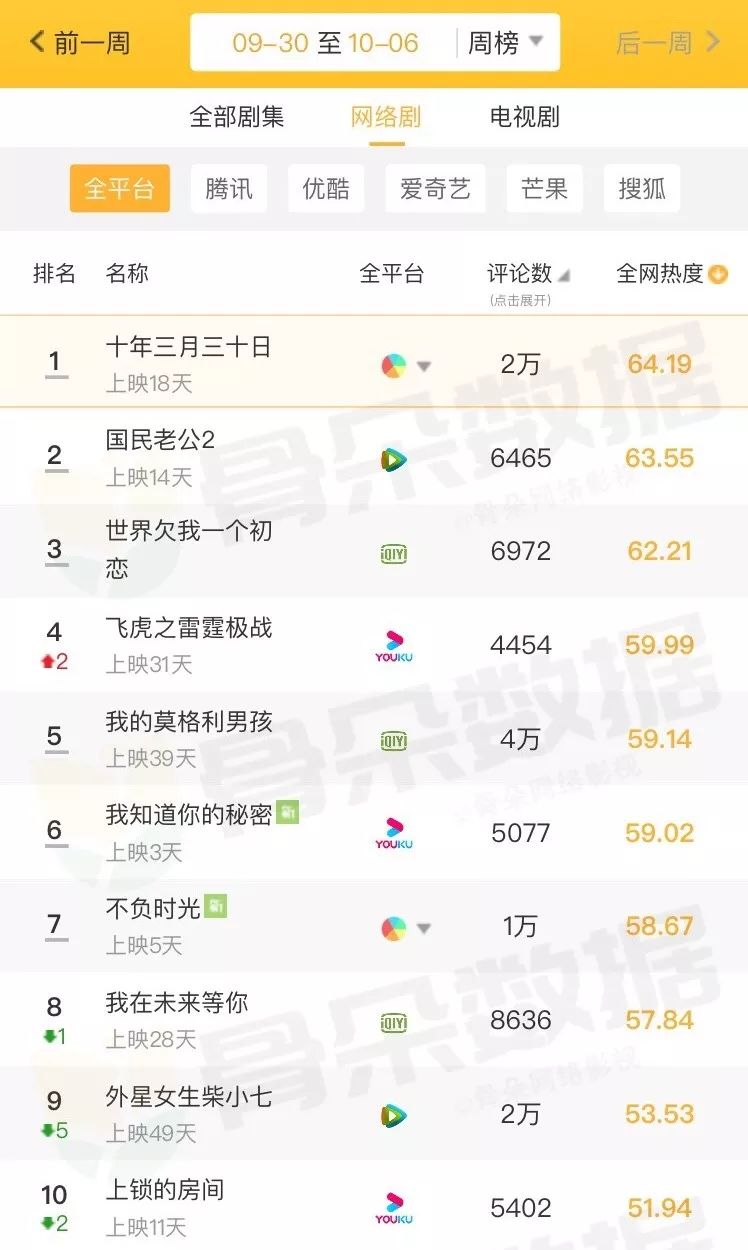 从评论量和热度分析,《十年三月三十日》《国民老公2》《世界欠我一个初恋》《飞虎之雷霆极战》等剧集表现不错,且优爱腾三家均有热度较高剧集。《我知道你的秘密》《不负时光》等新剧上线也已收获不少剧粉评论,热度有待进一步发酵。