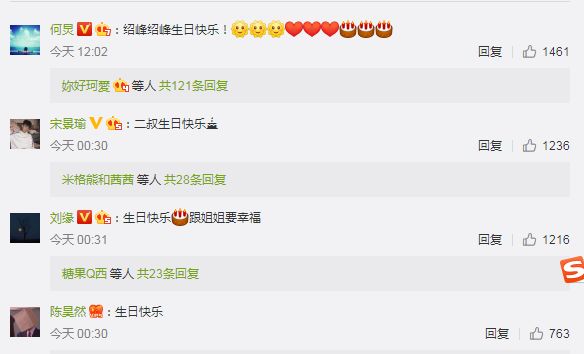 赵丽颖和冯绍峰圈内人缘很好,有不少明星也过来送祝福,其中就包括:何炅、宋景瑜等人,纷纷祝贺冯绍峰生日快乐。还有不少铁杆粉丝也留言送生日祝福给冯绍峰,亲切称呼:帅哥、冯叔。咱们的二叔虽然已到40岁,但还是帅气依旧,是个帅哥了。
