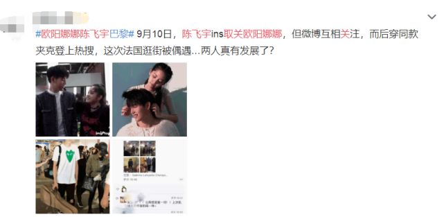 9月30日,有网友爆料称在法国的巴黎偶遇到了欧阳娜娜和陈飞宇。据爆料者称当时他们是跟小伙伴一起在香街新开的店里面闲坐。只不过当被欧阳娜娜的助理发现后,马上就带着欧阳娜娜走了,所以爆料者一时之间还未来得及拍照片。