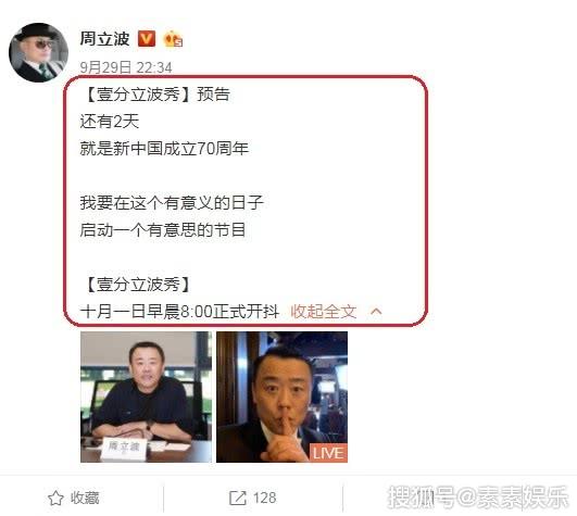 但无疑的就是周立波这一次直的回归了。9月29日的周立波亲自更新发文,声称“壹分立波秀”预告还有2天,就在这个新中国成立70周年的有意义的日子里,启本了这么一个有意思的节目,并且是定时于10月1日正式开始!