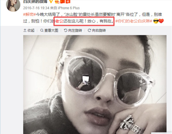 如今她怎样呢?她变成了“老公”!没错就是这位A爆的老公,微博中白庆琳常常以老公自居,各种A爆照片纵横于江湖。