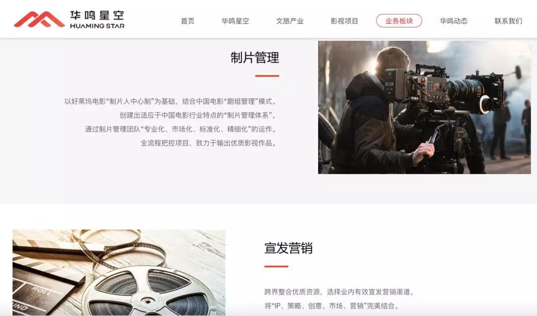 华鸣星空官网显示,其业务涵盖影视投资、制片管理、宣发营销和艺人经纪,然而除了影视投资部分列举了曾经投资的影片,其它版块似乎并没有相关案例。