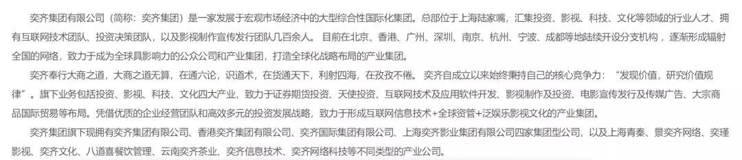 成立于2016年,法人殷一鸣,奕齐集团旗下公司。根据官网显示,奕齐集团旗下业务包括投资、影视、科技、文化四大产业,通过子公司上海奕齐影业集团有限公司,参与了《名侦探柯南:绀青之拳》的国内推广,参与出品了《下一任:前任》《八月未央》等多部电影。