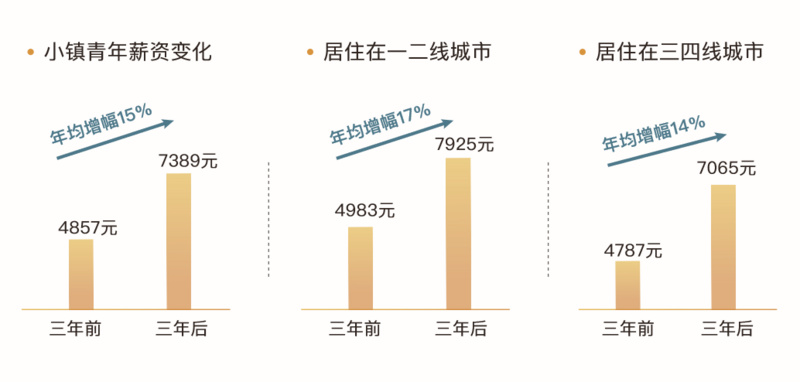 白皮书数据显示,与三年前相比,小镇青年的收入平均每年增长15%,远高于7%的全国平均水平,而奋斗在一二线城市的小镇青年收入增幅达到了17%,比三四线的同龄人高出了3个百分点,还有39%的人认为自己已经适应了大城市的快生活节奏。三四线的小镇青年则有了更坚定的人生观,确信人生应该有家有房,幸福安稳,对生活质量的满意度也更高。重要的是,无论是居住在一二线还是三四线的小镇青年, 都一致认为生活在往好的方向发展。