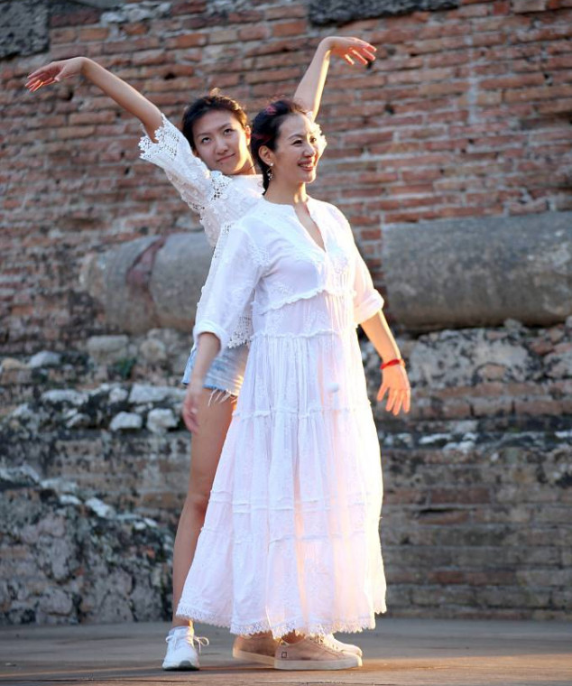 而十九岁的宝贝女儿九儿,在拍摄现场十分活泼,合影时恬静端庄,和妈妈单独拍照时又举起手臂,搞怪有趣。